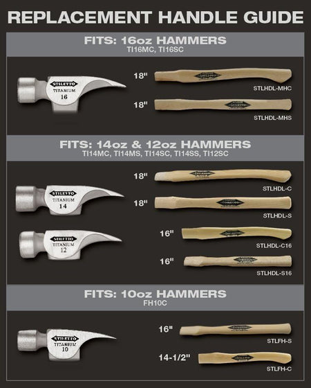 The STILETTO® Replacement 14.5" Curved American Hickory Reverse Axe-Eye handle fits 10oz titanium heads. Hardware and instructions are included.