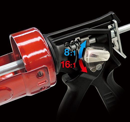 Equipped with Duel Power, the thrust ratio can be switched between 8:1 and 16:1 by moving a single lever up and down. By changing to 16:1, it is possible to improve thrust by about 40%. The SST system makes it easy to use high-viscosity materials. The 360° Rotating Handle™ is ideal for maneuvering in and around tight spaces.