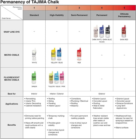 - FADE RESISTANT LINE - Fade-resistant chalk makes a sharp and extremely bold line for semi-permanent marking jobs