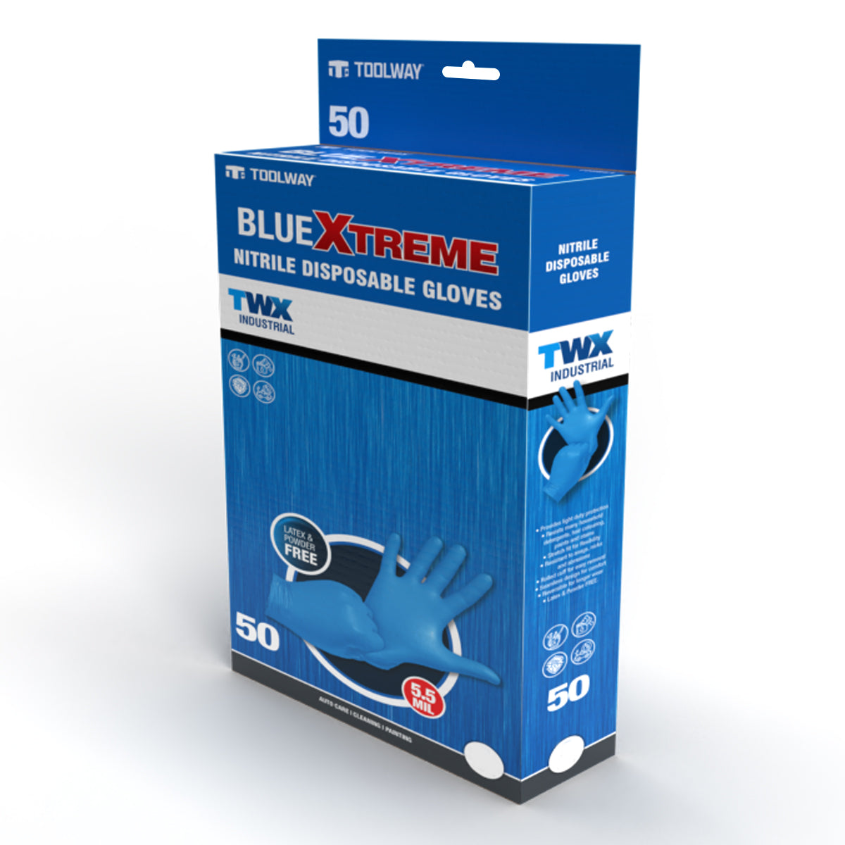 Toolway 105652, 50PK LATEX FREE DISPOSABLE NITRILE GLOVES 5.5 MIL BLUE (M)