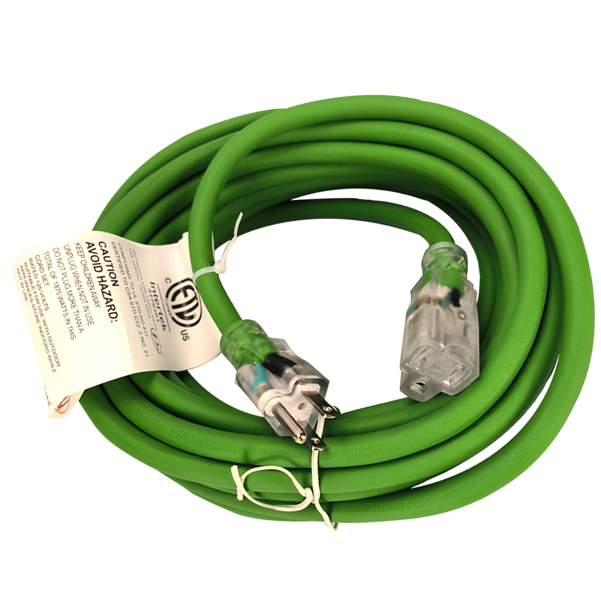Ultraflex outdoor extension cords by Toolway are perfect for all job sites and working conditions. These heavy duty cords are designed with a durable high-visibility green rubber jacket; allowing them to remain flexible and prevent cracking in arctic cold or melt in desert heat. They are rated to 125V and are equipped with led power indicator ends; which allows you to see if there is power going through them from a distance. These cords are also water; ozone and oil resistant. Applications: chain saws; wet/dry vacs; orbital sanders; outdoor equipment - 3-conductor grounded | type: SJEOW | -50°C to 105°C| 125 volts | cETLus listed | 12 gauge"