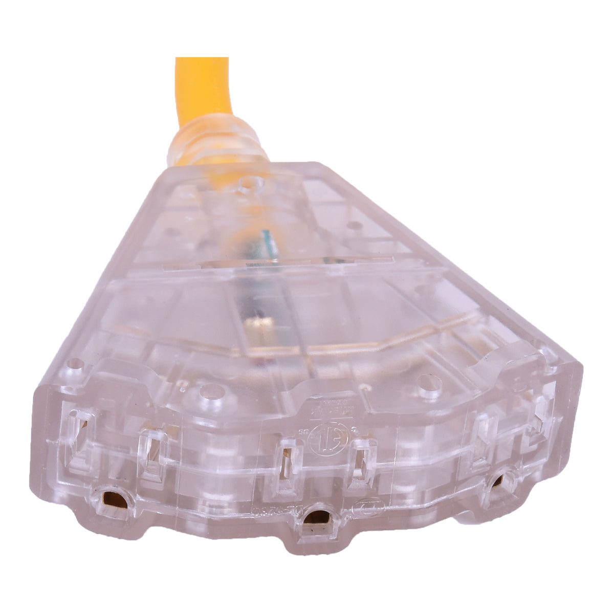 Ultraflex outdoor extension cords by Toolway are perfect for all job sites and working conditions. These heavy-duty cords have connector ends that light up which allows you to see if there is power going through them from a distance. The Durable PVC jacket resists moisture while allowing the cable to remain flexible and prevent cracking in arctic cold or melt in desert heat. The Yellow durable PVC jacket provides high visibility on job sites; while the Lit 3-outlet fantail serves as a power indicator while offering more outlets on the job. Can be used with chain saws; wet/dry vacuums; orbital sanders; and outdoor equipment."
