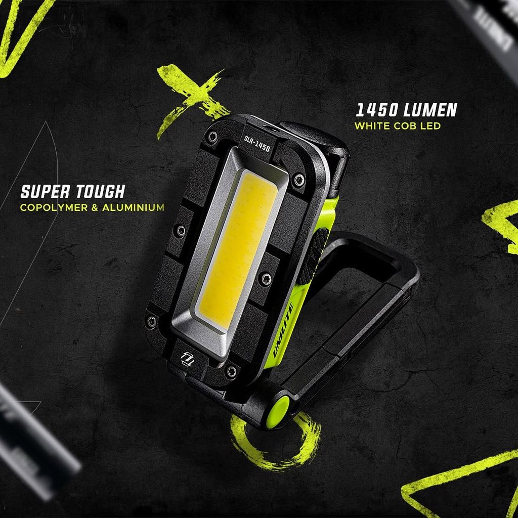The SLR-1450 Work Light, featuring a powerful 1450 lumen white COB LED with 6500k colour temperature. This versatile light also includes a 150 lumen white LED flashlight, as well as 45 lumen Red and Red flash modes for added functionality. The light is powered by a 'LG' 3.7v 5000mAh 21700 Li-ion battery, which can be easily charged via USB-C in just 3 hours. The light is built to last with a super tough copolymer and aluminium construction, and features a 180˚ rotating handle/stand with carabiner snap hook, strong magnets within the stand, and a glow-in-the-dark strip for extra visibility. The battery level and charging indicators allow for easy monitoring, and the battery can even be removed for convenience. The 21700 battery has its own USB-C port, allowing it to be used as a 1A powerbank or easily charged out of the lamp. A 1m high quality USB-C cable is included for easy charging.