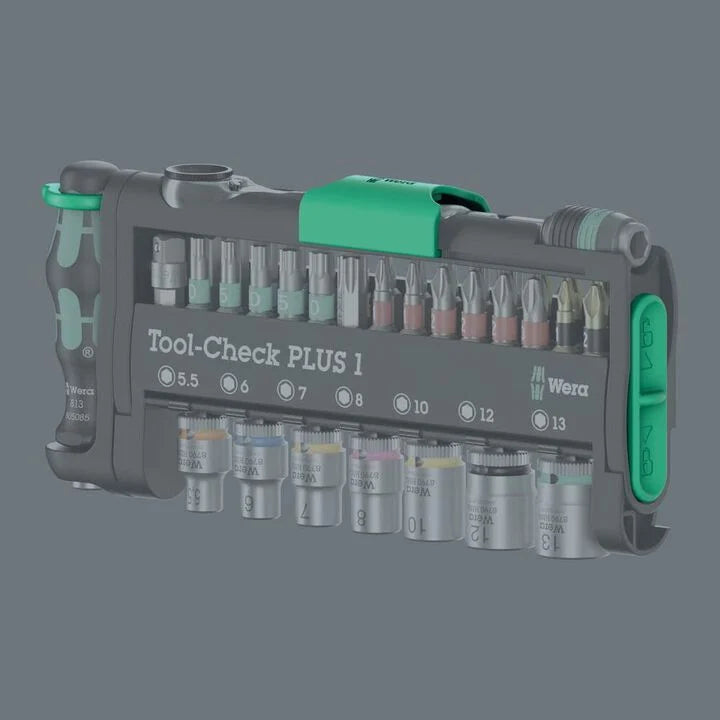 39-piece set. Very compact tool set for manual and machine use. The green locking elements of the Tool-Check secure the tools during transport. Includes one 1/4" bit ratchet in drop-forged solid steel design. Fine toothing mechanism (60 teeth) for a small return angle of 6° for precise working. Easy clockwise/counterclockwise switching. Ergonomically shaped ratchet head and lever. 1/4" sockets can also be used with the Wera 870/1 adapter (1/4" external hexagon to 1/4" external square head) included in the set. 7 Zyklop sockets (1/4", imperial sizes) for manual and machine-operated tools; with ball stop groove. Knurling at the rear end for manageability during manual screwdriving. With Take it easy tool finder: colour coding by size - for quick and easy identification of the required tool. Made of matt chrome-plated chrome-vanadium. 28 bits, BTZ design with BiTorsion zone (prevents the bit from breaking prematurely) and Take it easy tool finder: colour coding by profile and size stamping, tough design (Z) for universal use, Phillips, TORX, TORX BO, slotted and square head for universal use. In the very compact, functional Tool-Check.