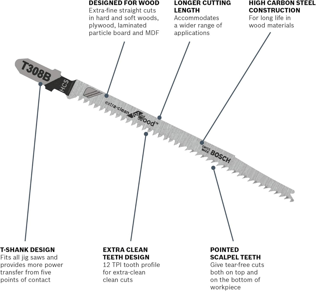 - 12 TPI tooth profile and high carbon steel blade body for extra-clean clean cuts and long life in wood