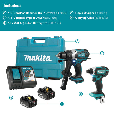 Makita DLX2005T, 18V LXT 2PC Combo 5.0Ah Kit (DHP458Z+DTD152Z)
