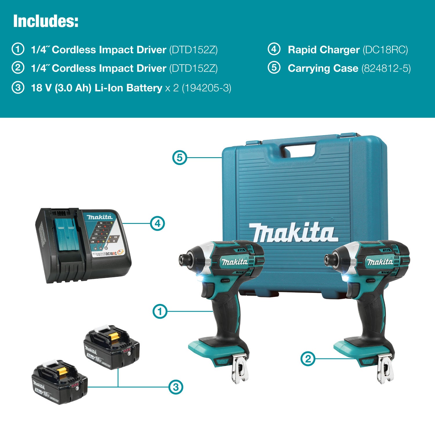 - Two 1/4” Cordless Impact Driver (DTD152Z)