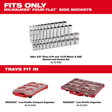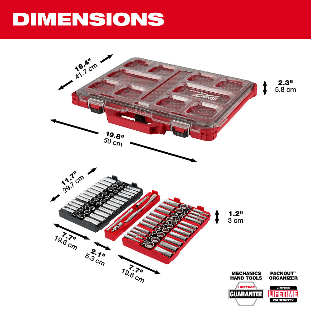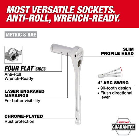 Our 98pc 3/8" Drive 6-Point and 12-Point Ratchet and Socket Set feature sockets with FOUR FLAT™ Sides that deter rolling and are wrench compatible for maximum productivity. The 90-tooth ratchet tool provides 4° of arc swing and a slim profile for work in tighter spaces. The laser-engraved size markings provide easy identification, and chrome plating offers rust and corrosion protection. The SAE & Metric 6-point and 12-point sockets come organized in a PACKOUT™ Low-Profile Organizer, which comes equipped with a clear top for easy identification of parts at a glance. This PACKOUT™ Organizer is IP65-rated and built from impact-resistant materials for durability on and off the job site with a reinforced hinge and heavy-duty latches. The Low-Profile Organizer is part of the MILWAUKEE® PACKOUT™ Modular Storage System, which is the most versatile and durable in the industry. A Limited Lifetime warranty covers the PACKOUT™ Low-Profile Organizer, while a Lifetime Guarantee backs the ratchets and sockets.