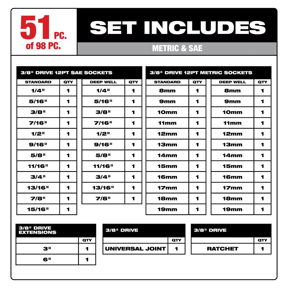 Milwaukee 48-22-9285, 98pc 3/8" 6-Pt and 12-Pt Metric & SAE Ratchet & Socket