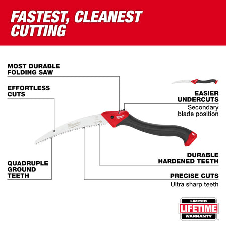 Our 10" Folding Pruning Saw delivers the Fastest, Cleanest Cutting. The Saw's ultra-sharp teeth provide effortless, precise cutting on branches up to 6". This is the most durable folding saw in the industry, and features hardened teeth that stay sharper for longer. Quadruple ground teeth and a curved chrome-plated blade improve cutting performance for increased productivity on the job. The secondary blade position provides easier undercuts and flush cuts. The 10" Folding Pruning Saw is covered by a limited lifetime warranty.