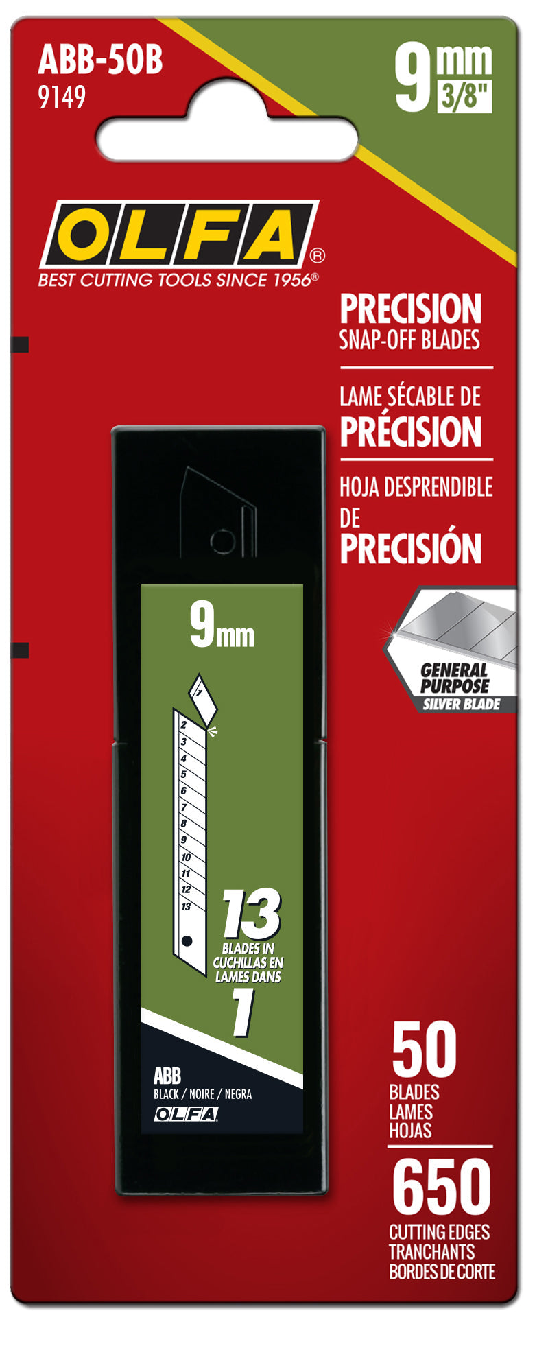 Use this 9mm snap blade for fine, detailed cutting such as wallpaper, masking, and more. Each blade offers 13 sharp segments that are easy to snap when you need a fresh edge. Etched grooves provide a clean break and allow you to keep working with ease.